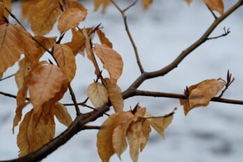 Those stubborn leaves belong to marcescent trees. In marcescence, leaves die in the fall but don’t drop. Instead, they hang on through cold and wind, only releasing when new spring growth pushes them off.