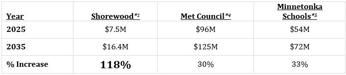 Based on current and past budget reports from Shorewood, Met Council and Minnetonka Schools, the following data was extrapolated for comparisons. Your comments are strongly encouraged and will be quite enjoyable to read!