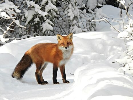 Fun facts: The red fox runs 30 mph, and can leap 15 feet in a single bound–farther than a kangaroo. It is one of the few predators that store food items for future use.